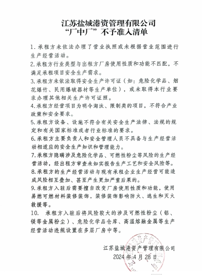 (三)加强风险源头管控,制定不予准入清单,出租的厂房须满足承租项目安全生产需求,违反规定改变厂房使用性质、不符合工程建设安全标准的不得出租;承租项目必须符合产业政策和安全要求,存在突出风险相互叠加或重大事故隐患未按规定整改等问题的要坚决清退,不具备安全生产条件以及明令淘汰、限制类项目不得租赁厂房进行生产。不予准入清单报属地监管部门审核。