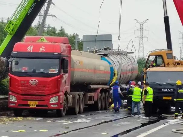 根据现场险情,公安交警部门第一时间封锁事故现场,禁止一切车辆靠近,消防大队出动消防车对事故车辆罐体进行喷射冷却,联系吊车对其进行罐体扶正工作,随后由危化品运输公司救援抢险队使用相关设备将泄漏罐车内的“高沸点芳烃”进行抽取,并转移至指定安全区域。
