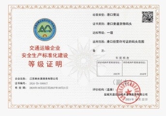 近日,盐城港响水港区顺利通过交通运输企业安全生产标准化达标认证考核,喜获“交通运输企业安全生产标准化建设一级证书”。响水港区在安全生产管理体系精细化、规范化、标准化建设方面迈入新的发展阶段,为推动港口安全生产工作再上新台阶奠定了坚实基础。