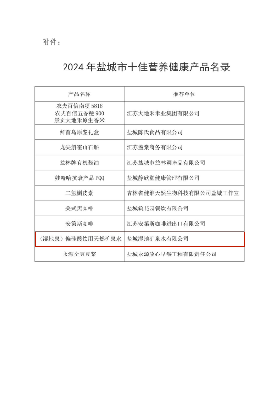 近日,盐城市十佳营养健康产品评选结果出炉,盐城湿地矿泉水有限公司“湿地泉”系列偏硅酸饮用天然矿泉水荣获2024年盐城市十佳营养健康产品称号。