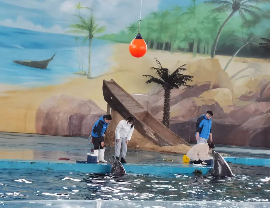 在海洋剧场,海豚明星们与驯养师默契配合,在水中奉献出一场场精彩的演出,海豚们灵活的身姿、可爱的外表、天籁般的歌声以及驯养师们卓越的水秀技巧,赢得了现场观众的阵阵欢呼。