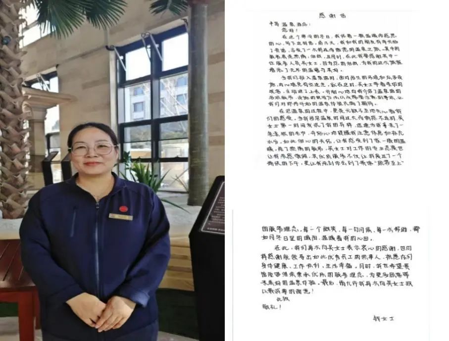 在港泊半岛酒店,暖心的故事每天都在上演。近日,酒店收到了一封来自温泉馆客人的感谢信。信中,客人用真挚的笔触,对温泉馆员工吴月华的服务赋予了极高的评价。为了弘扬这种敬业精神,树立酒店服务的全新标杆,港泊半岛酒店开展了向优秀榜样吴月华学习的活动。每一位员工都积极响应,将热忱融入日常服务的每一处。他们以实际行动诠释着五星级酒店的品质与担当,致力于为每一位宾客打造更加优质、贴心、温暖的入住体验,用心雕琢着港泊半岛酒店的卓越口碑。