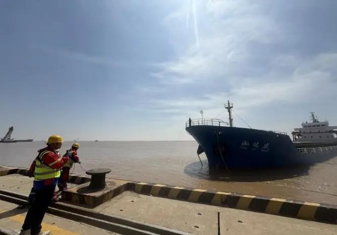 在射阳港区码头前沿,穿戴整齐调度员正和船长、码头操作人员通过对讲机保持密切沟通,根据实际情况发出靠泊指令,指挥船舶控制航速、调整船位,确保船舶平行、缓慢地靠近泊位。同时提醒码头操作人员准备好缆绳、护舷等设备,完成系缆固定船舶工作。满分穿搭为调度员的日常工作保驾护航,精准调度为下一步的装卸作业提供了坚实的保障和高效的指引。