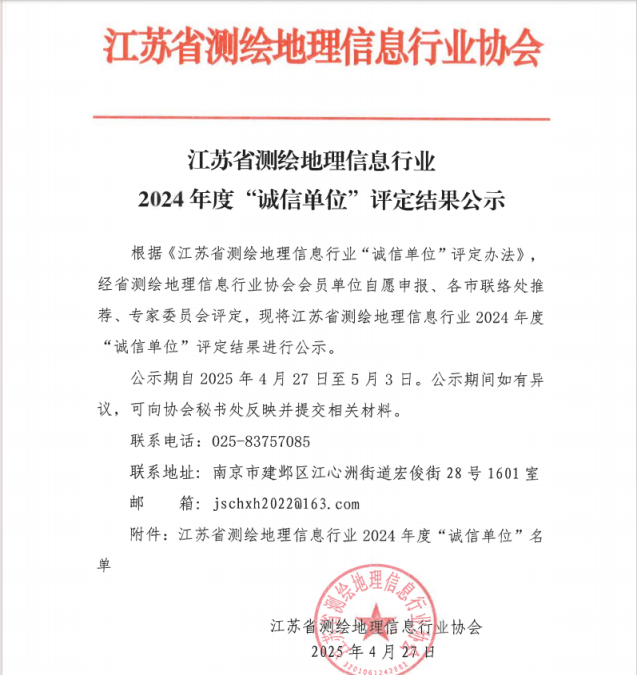 近日,江苏省测绘地理信息协会正式发布2024年度行业"诚信单位"评选结果,盐城港港航勘测设计有限公司凭借卓越的诚信经营表现和专业技术实力,成功获评此项殊荣,不仅是对企业诚信体系建设的高度认可,更是对其在测绘地理信息领域专业能力和服务质量的全面肯定。