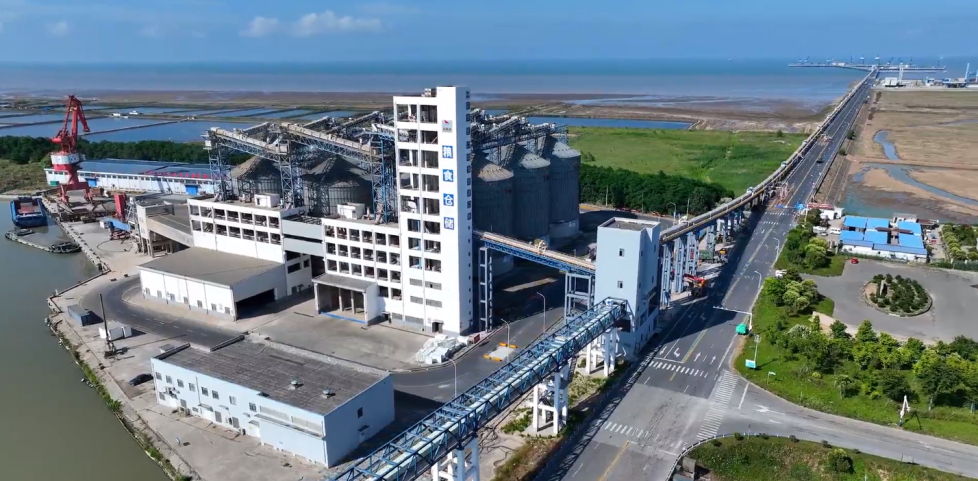 蓝色的全封闭式散粮输送机连接天与海,从码头延伸至粮食筒仓,远远看去,宛若一条水龙,盘旋缠绕在仓顶。在自动化控制系统的加持下,粮食运输的流量和方向精准无误,智能化作业效率提档加速,人工成本和粉尘污染不断减少,输送损耗率下降至零,俨然成为粮食高效运作的“主力军”。