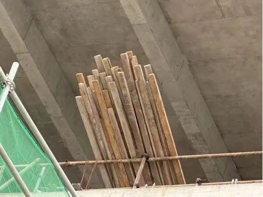 混凝土结构施工区域,浅棕色木方违规倾斜堆放于临边围挡处,遇外力(如碰撞、大风)易发生坠落,威胁下方作业人员安全。