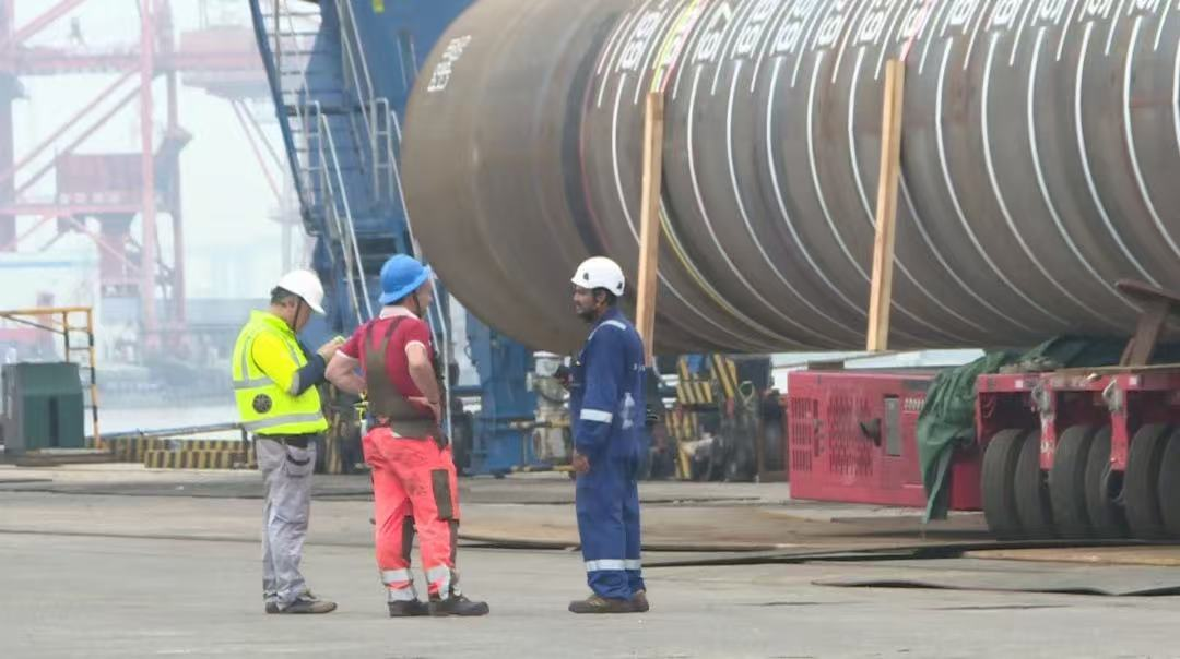 “幸福号”货轮承载着江苏天能海洋重工有限公司精心制造的尖端管桩装备,这些“大国重器”将远赴中东,为当地油气资源开发提供关键基础设施支持。全船共装载45件管桩及配套钢结构,其中管桩长度普遍超过40米,最长达76.8米,单件最大重量突破377吨,堪称“海上钢铁巨龙”。