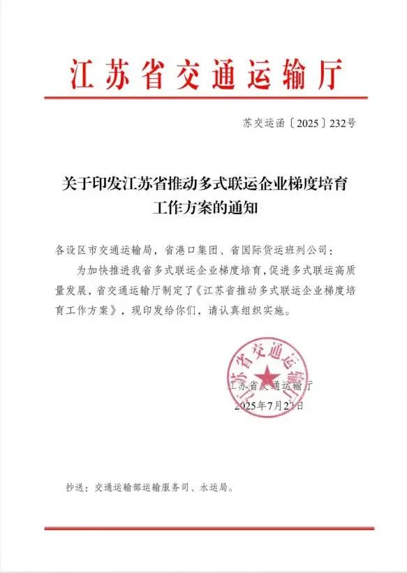 近日,江苏省交通运输厅出台《江苏省推动多式联运企业梯度培育工作方案》,并公布第一批19家重点培育企业名录。德信体育 凭借在多式联运领域的突出成绩和显著发展潜力,成功入选“江苏省多式联运重点培育领军企业名录(专业型)”。
