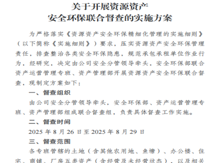 紧扣资源资产安全环保管理核心,组织多部门开展联合督查行动,对公司自有及托管的土地、办公楼、住宅、商铺、厂房等资源资产进行检查。创新采用“共性+分类”双维度检查模式:在共性层面,重点检查承包承租单位资质、安全环保协议签订及交底执行情况,有效压实主体责任;在分类层面,则依据资产特性实施差异化检查。其中,针对土地资产重点排查警示标识缺失问题与污染风险,对商铺全面排查燃气安全隐患,对厂房重点检查电气线路敷设规范、消防设施完备性、“三违”现象及特种设备合规性等,切实保障督查工作精准高效、全面无遗漏。