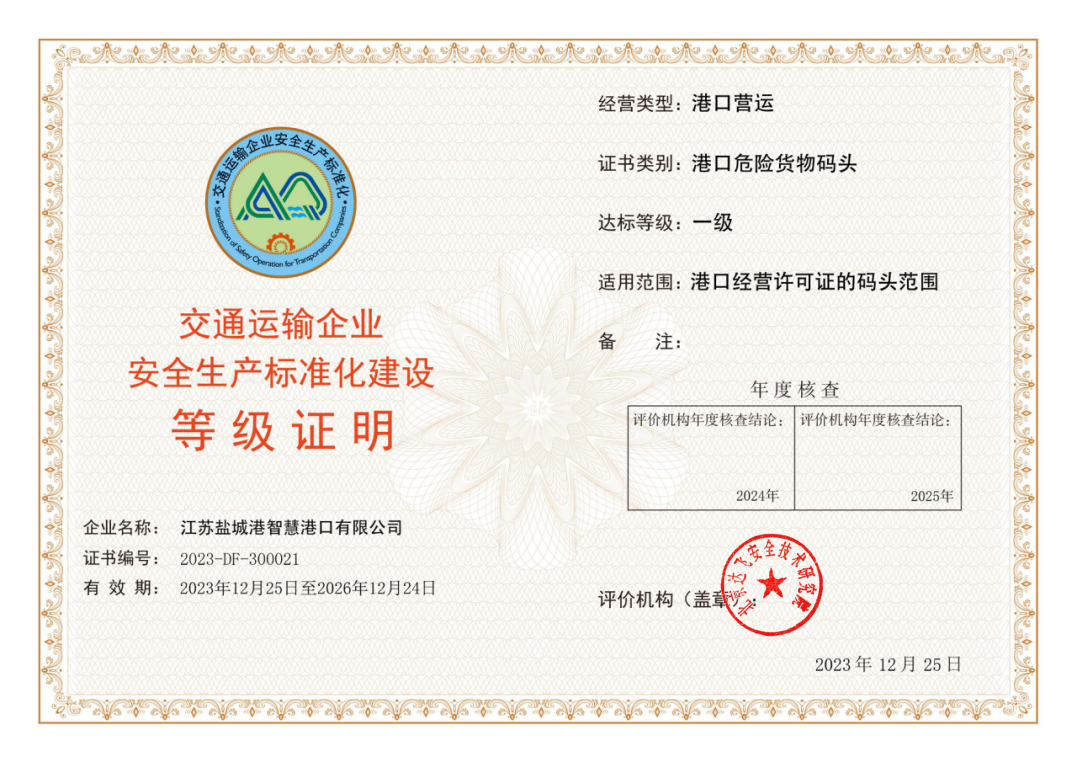 近日,江苏盐城港智慧港口公司顺利通过交通运输企业安全生产标准化达标认证考核,喜获“交通运输企业安全生产标准化建设一级证书”,标志着智慧港口公司安全生产管理体系精细化、规范化、标准化建设迈上新台阶。