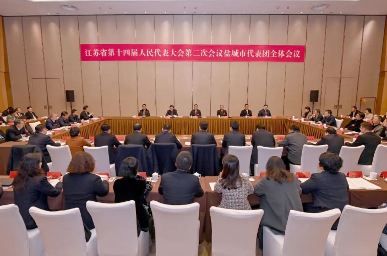 江苏省第十四届人民代表大会第二次会议将于1月23日上午在南京开幕。22日晚,盐城市代表团在驻地召开全体会议,传达学习省两会党员负责同志会议精神和省委书记信长星讲话要求,推选代表团团长、副团长,宣布小组召集人名单,审议有关草案。