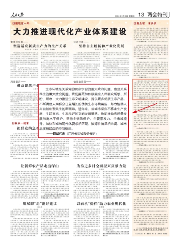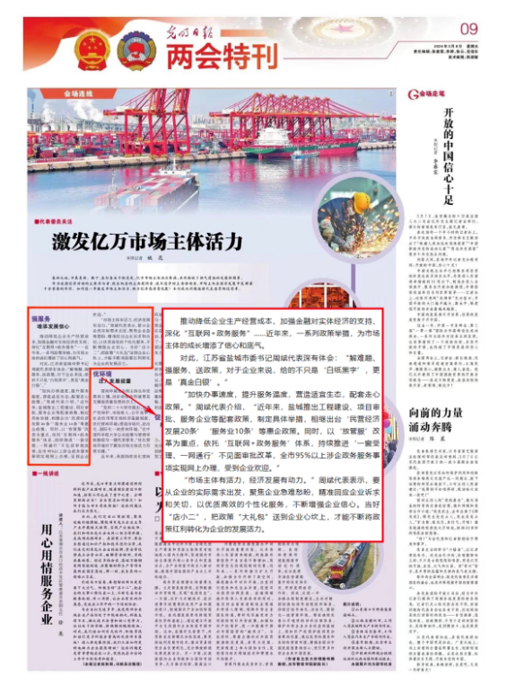 对此,江苏省盐城市委书记周斌代表深有体会:“解难题、强服务、送政策,对于企业来说,给的不只是‘白纸黑字’,更是‘真金白银’。”
