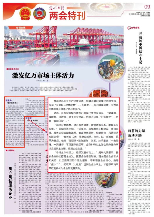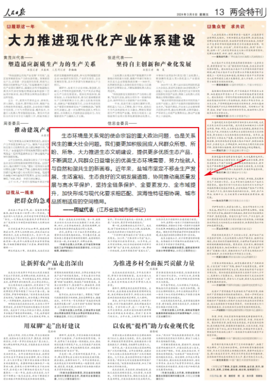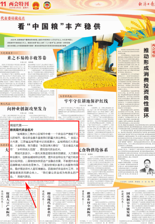“盐城是长三角中心区城市中唯一一个农业总产值超千亿元的城市,稳住农业基本盘是我们的重大政治责任。”全国人大代表、江苏省盐城市委书记周斌表示,盐城将践行大农业观、大食物观,努力建设“东部沿海大粮仓”“生态食品大超市”“乡村休闲大花园”,擦亮现代农业名片。